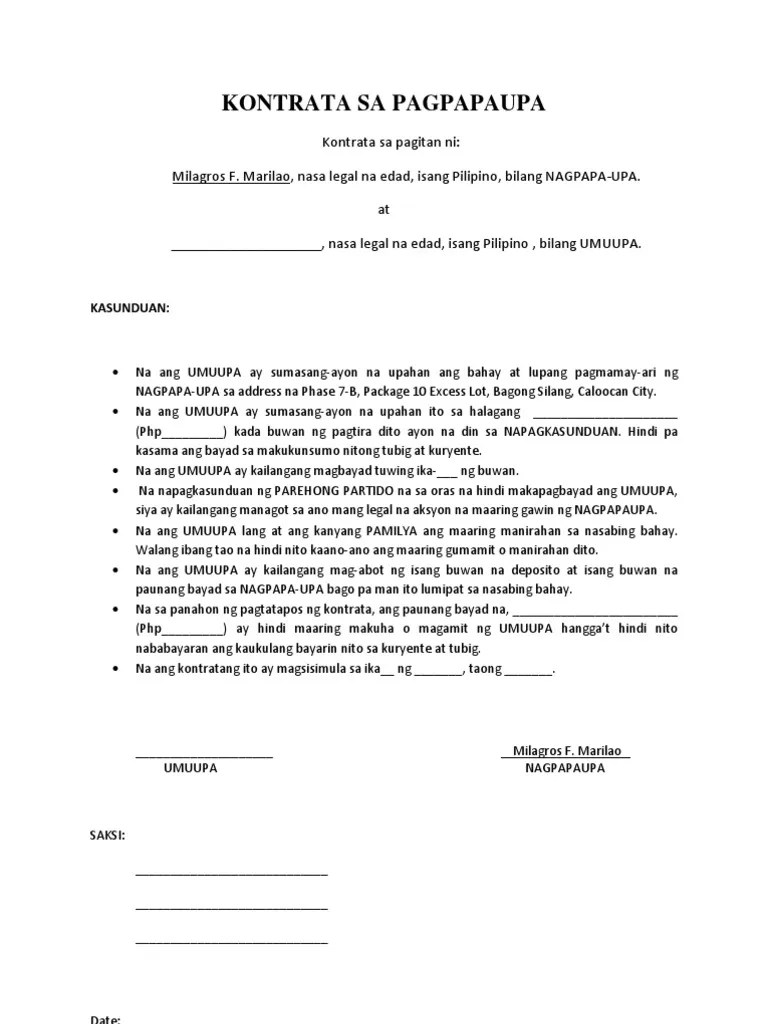 Kasunduan format sangla agreement sample kasunduan sa bilihan ng lupa there are 2 types of rental contracts in india one being a lease.
